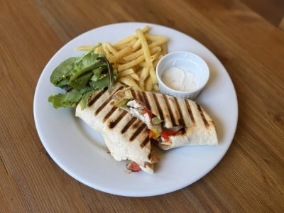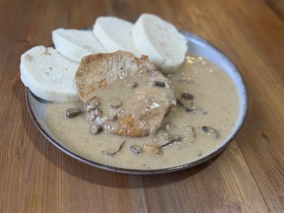 Steak z vepřové panenky, cheddarová omáčka, hranolky