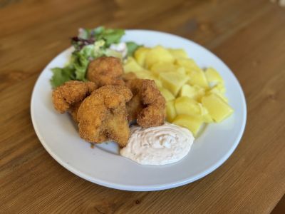Kuřecí řízečky, šťouchané brambory s jarní cibulkou