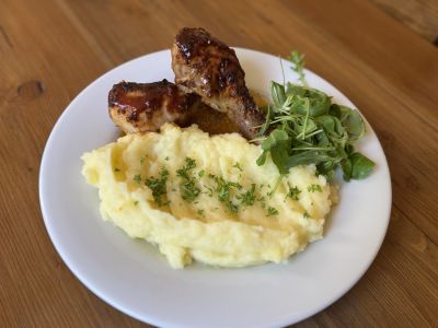 Přírodní kuřecí prsa s restovanou ang. slaninou, čedarová omáčka, vařené brambory s jarní cibulkou. 17