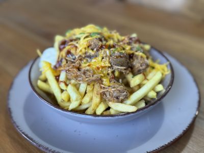 7. Trhačka (BBQ/čedar) 200g vepřové trhané maso, 200g bram. lupínky, posypané cibulkou