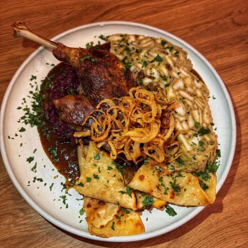 Konfitované kachní stehno podávané s knedlíkovou variací, dušeným červeným zelím na jablkách a výpekovou šťávou