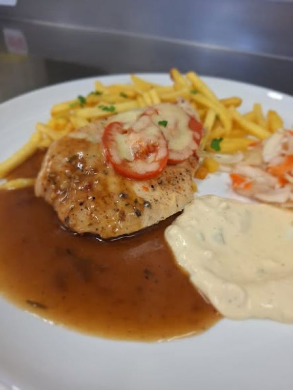 150g Grilovaná vepřová panenka s restovanými žampiony a smetanovou omáčko, hranolky