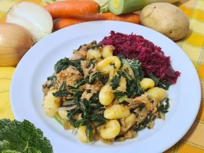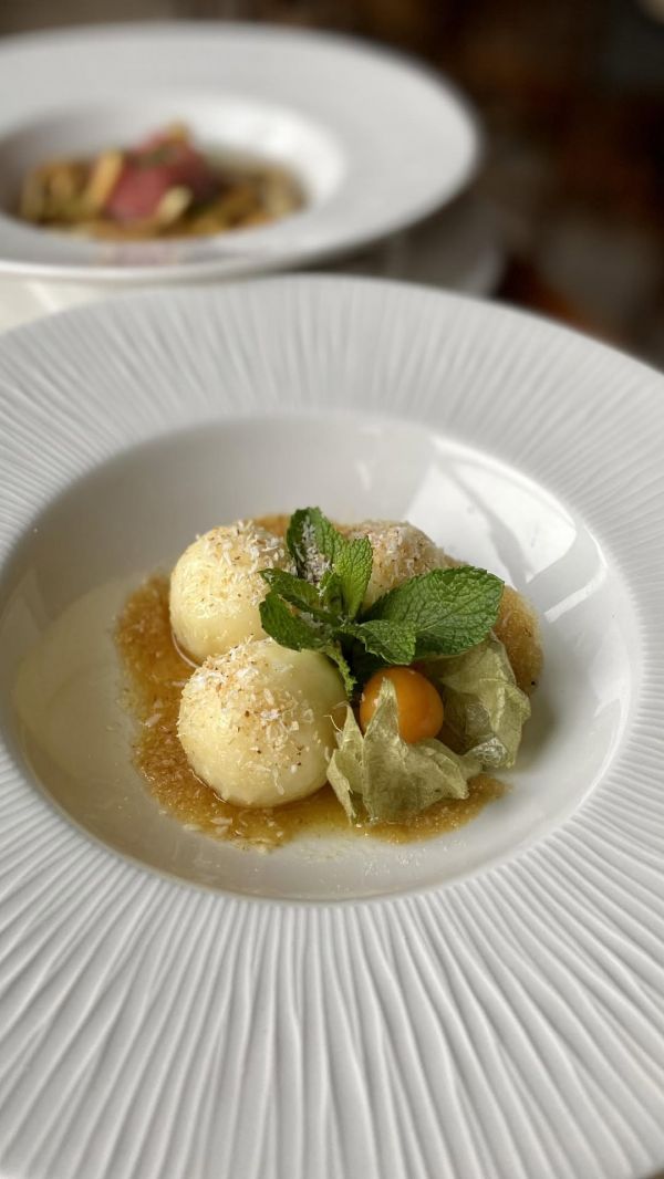 Špenátovo-ricotové noky s filírovanou vepřovou panenkou v gorgonzolové omáčce zdobené smaženou rukolou a vlašskými ořechy