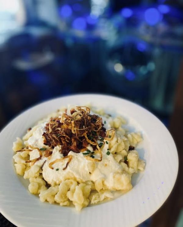 Pečená čtvrtka kuřátka na kmíně, podávána na haluškách s dušeným hlávkovým zelím a smaženou cibulkou