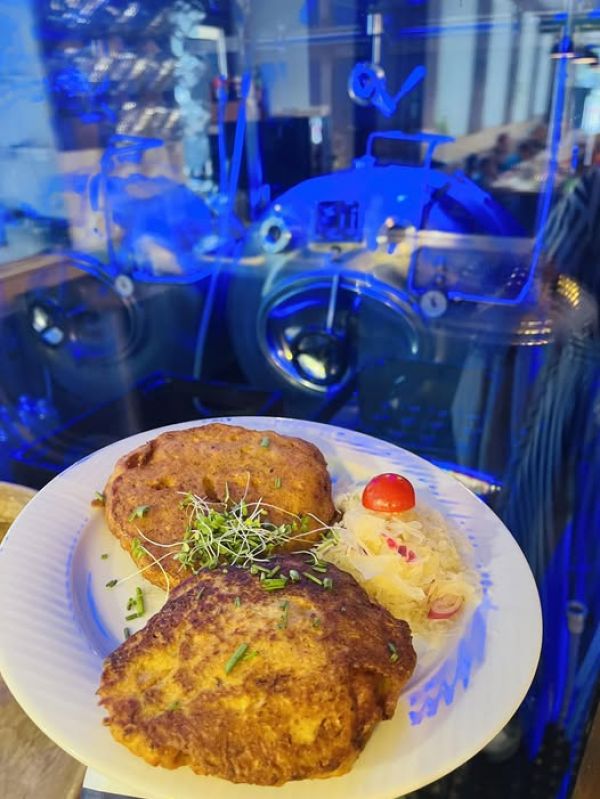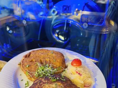 polévka nebo nápoj 0,3l, karbanátky z červené řepy s ovesnými vločkami, bramborová kaše, zelná obloha