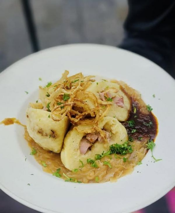 Plněné kynuté knedlíky trhaným masem s dušeným červeným zelím a smaženou cibulkou