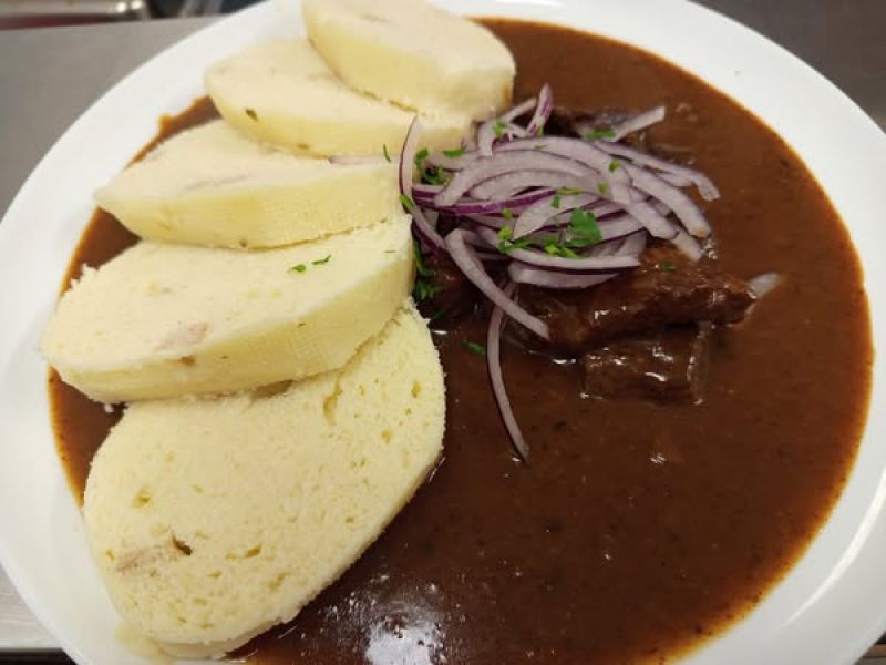 Hovězí gulášek podávaný s houskovým knedlíkem sypaný červenou cibulkou