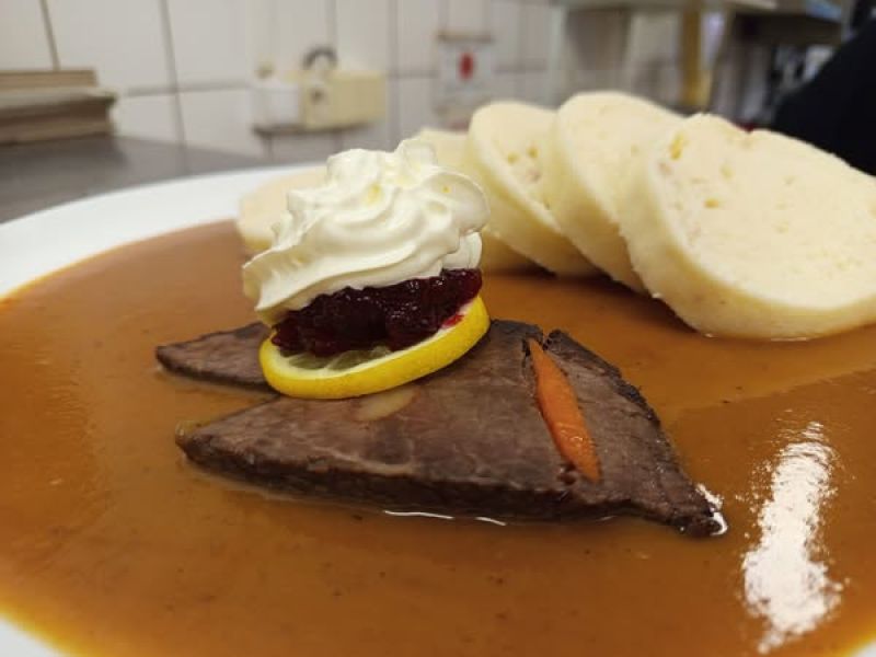 Vepřové výpečky na pivě, chlupatý knedlík, moravské zelí. 137