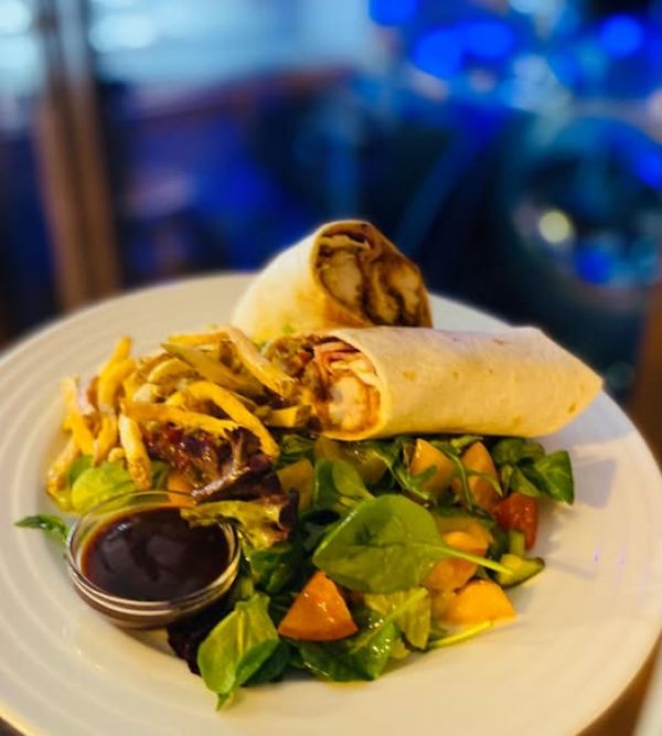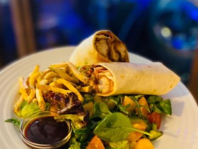Tortilla s krůtími stripsy, čedarem a slaninou, domácí hranolky, čerstvá zelenina
