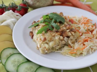 Vepřová kotleta zapečená s cibulí, slaninou a smetanou v bramborách