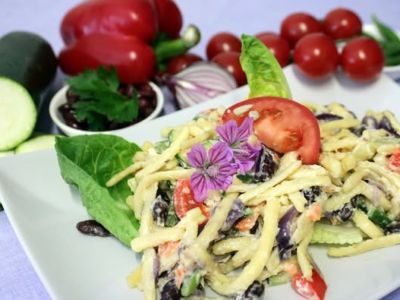 250g Těstovinový salát s tuňákem, kukuřicí a volským okem, dresink, jarní cibulka