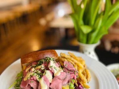 Hovězí hamburger s uzeným bokem, rukolou, alabama bbq a steakovými hranolky