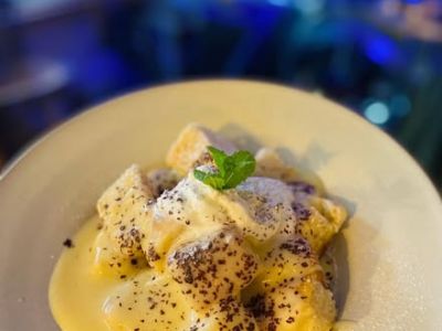 Menu 1. 250g kynuté borůvkové knedlíky s vanilkovou omáčkou