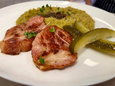 Menu 2. 150g PEČENÉ KOLENO NA ČESNEKU, špenát / zel, bramborové knedlíky