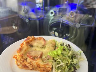 polévka nebo nápoj 0,3l, lasagne zapečené s kuřecím masem a špenátem, zelný salát