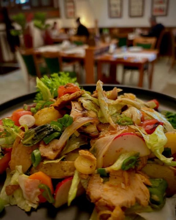 Mix trhaných salátů s tuňákem, olivami, pečeným bramborem a hořčičnou zálivkou s medem