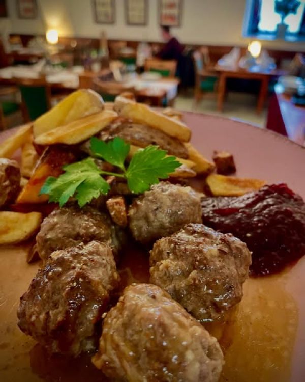 Rajská omáčka s hovězím kuličky a houskovým knedlíkem