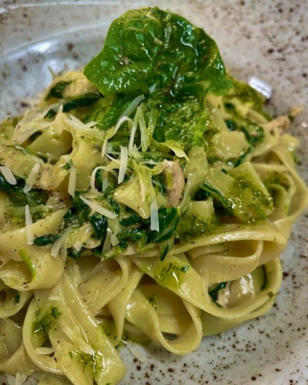 Špagety Pomodoro (cibule, černé olivy, bazalka, parmazán)