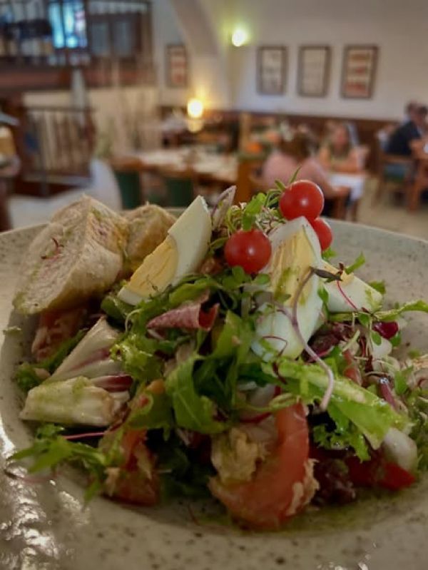 (300 g) Grilovaný hermelín na listových salátech se zeleninou, krutóny 17