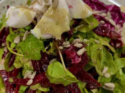 Salát z červené řepy s kozím sýrem, slunečnicovými semínky, rukolou a bagetu s česnekem