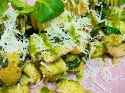 300g Gnocchi s vepřovou panenkou a hříbkovou omáčkou, zeleninový salát