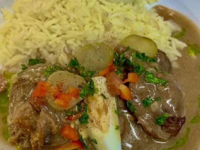 200g Rančerský kotlík s hovězími nudličkami, chléb (hovězí plec červená cibule, bílé fazolky, brambory, smetana, feferonky, červené víno)
