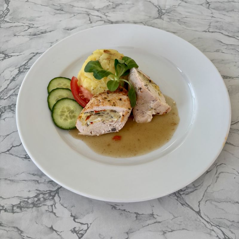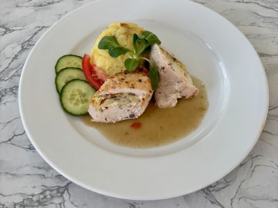 Smažená plněná kapsa "Gordon Bleu", brambory nebo hranolky, tatarská omáčka, salát