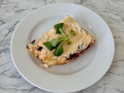 Zapečené brambory s uzeným masem a sýrem, okurek