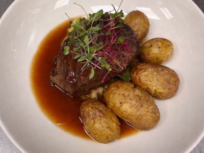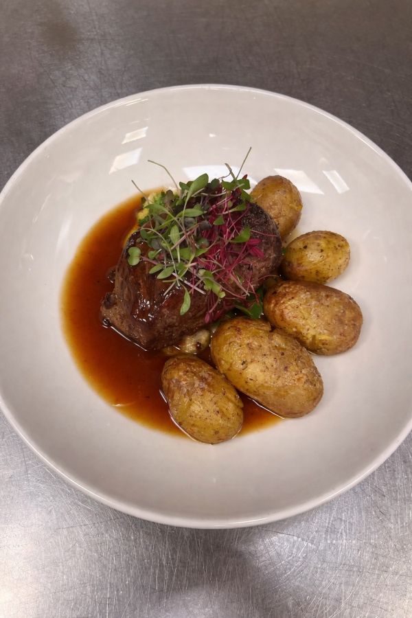 Teleci spider steak (pavouček) se šťouchanými bramborami, pepřovou omáčkou a fazolkami na slanině 13712