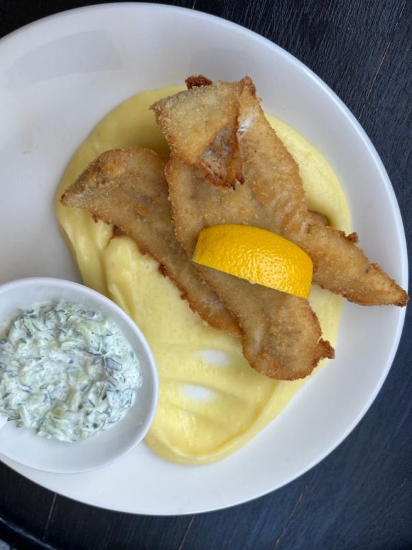 Smažený sýr, šťouchané brambory s opečenou cibulkou a tatarská omáčka