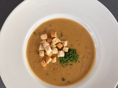 Krém z konfitovaného česneku s krutony a sýrem Gran Biraghi 137