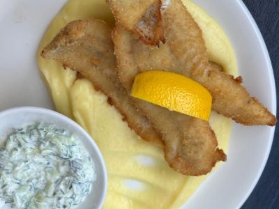 Smažené rybí filé, vařené brambory, citron