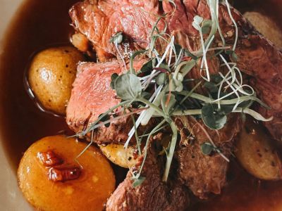 150g Hovězí ragů na červeném víně s glazovanou zeleninou a bramborovou kaší
