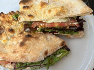Směs trhaných salátů s čerstvou zeleninou a pikantními krůtími špičkami, olivami, modrým sýrem a rozpečenou bylinkovou bagetkou 137