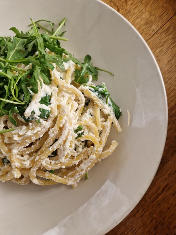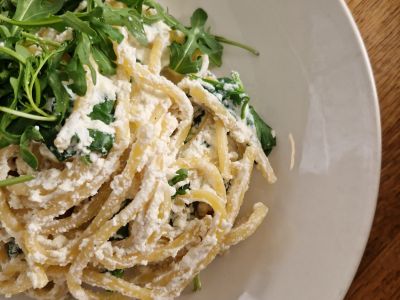 Tagliatelle s panenkou (chilli, česnek, šalotka, demi glace, rukola, parmazán)