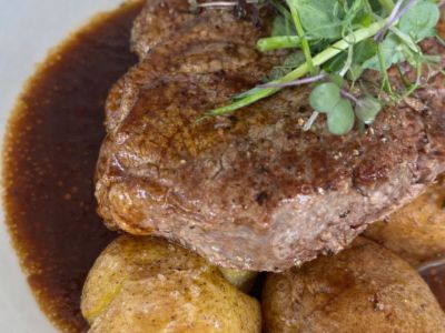 telecí hanger steak, farmářské hranolky, hříbková omáčka