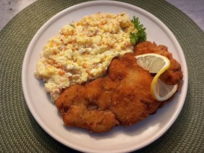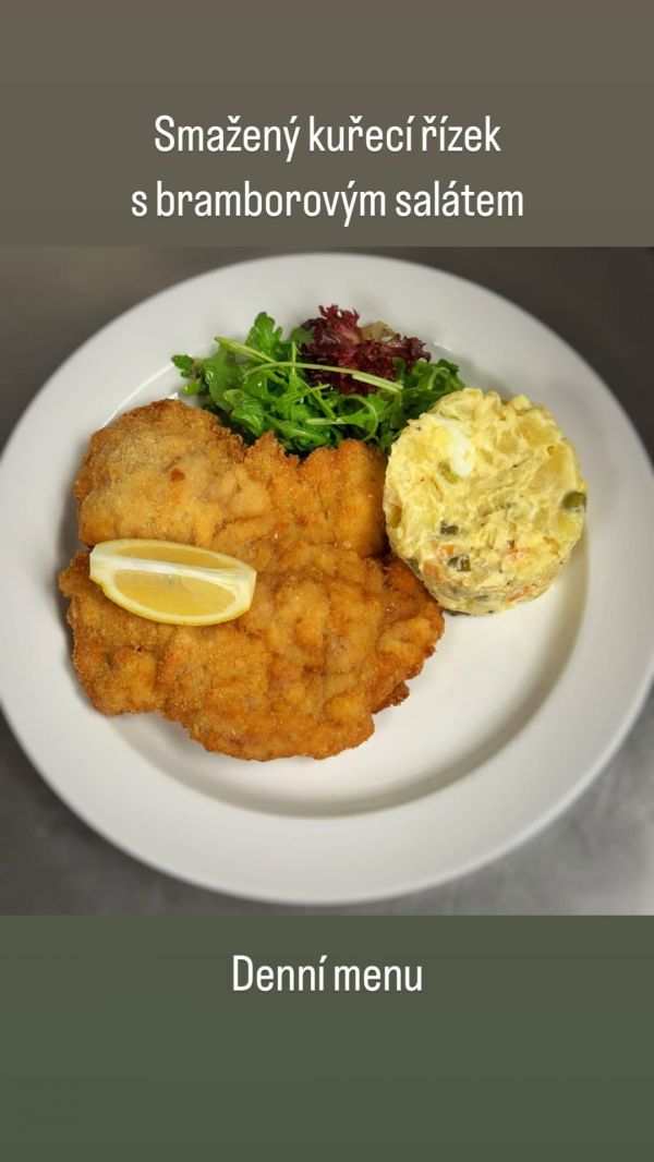 150g Vepřový, kuřecí řízek, vařený brambor, kyselá okruka