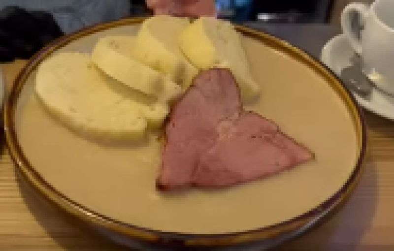 Halušky s uzeným masem a zelím - halušky z bramborového těsta, promíchané s pečenou cibulí, kysaným zelím, kousky uzeného masa a křupavou cibulkou (1,3,7,12)