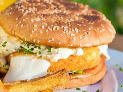 100g Grilovaný filet z čerstvého norského lososa, smetanový pórek v citrónové omáčce, smažené batátové hranolky