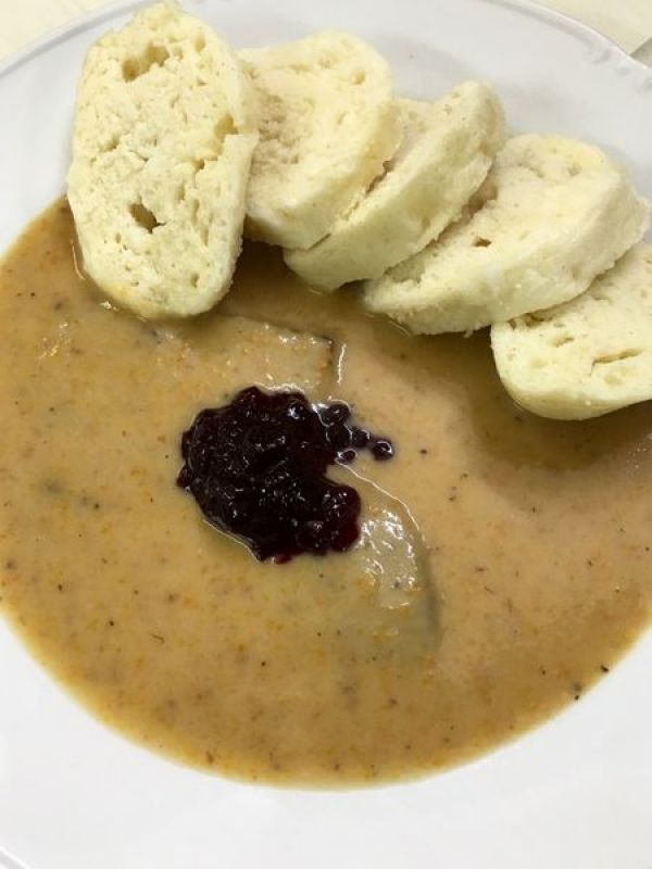 Hovězí líčka se svíčkovou omáčkou, Karlovarským knedlíkem a brusinkami