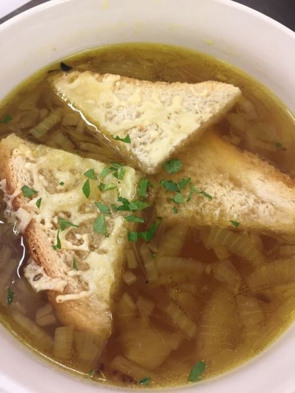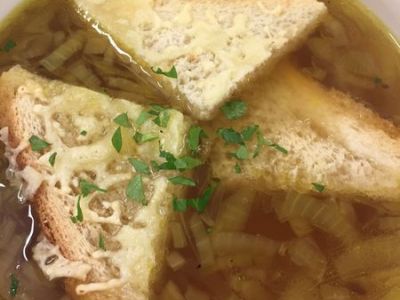 Menu --Francouzké brambory sypané nivou, kyselá okurka polévka