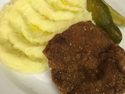 Kuřecí řízek na přepuštěném másle s mléčnou bramborovou kaší, kyselou okurkou a citronem