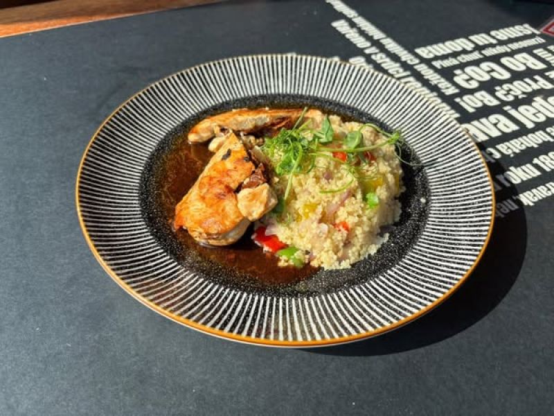Bulgurový salát s hruškami, fetou, pekanovými ořechy a rukolou, medovo-limetková zálivka, mikrobylinky, focaccia se sušenými rajčaty 1378