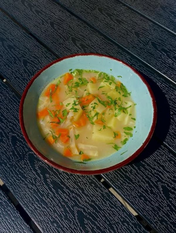 Polévka – rybí velouté, kořenová zelenina, uzená treska, petrželka.. 84, -