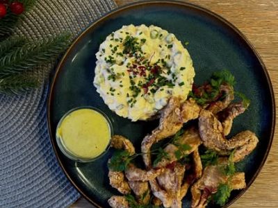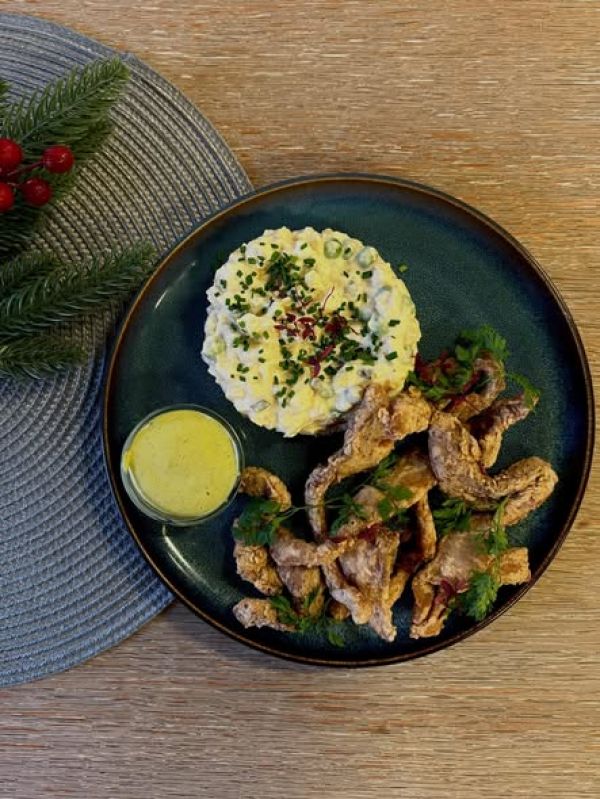 150g Smažený kuřecí řízek, bramborová kaše, salátek 1, 3, 7, 9