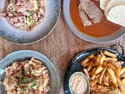 150g Ražniči z vepřové kotlety s cibulí, paprikou a slaninou servírované s restovaným bramborem a naší tatarskou omáčkou 17