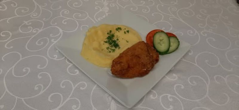 Domácí sekaná pečeně, bramborová kaše, nakládaná okurka
