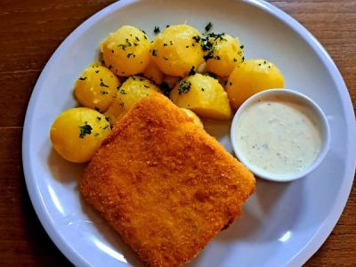 150g Vepřový Savojský řízek, bramborový salát, (šťouchaný brambor)