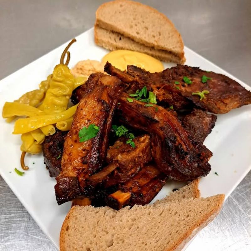 Uzená plec s křenovou omáčkou, houskové knedlíky