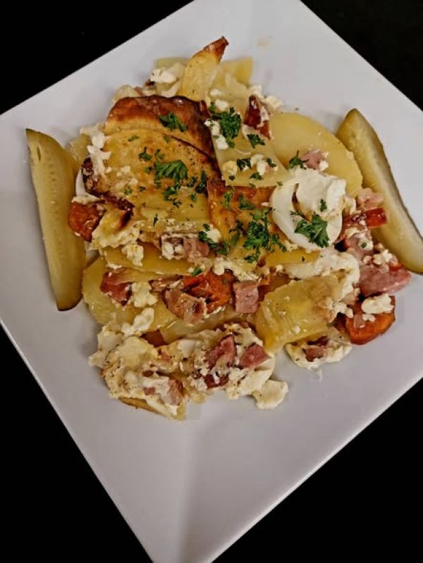 Grilované sýrové hranolky, opečený brambor, tatarská omáčka